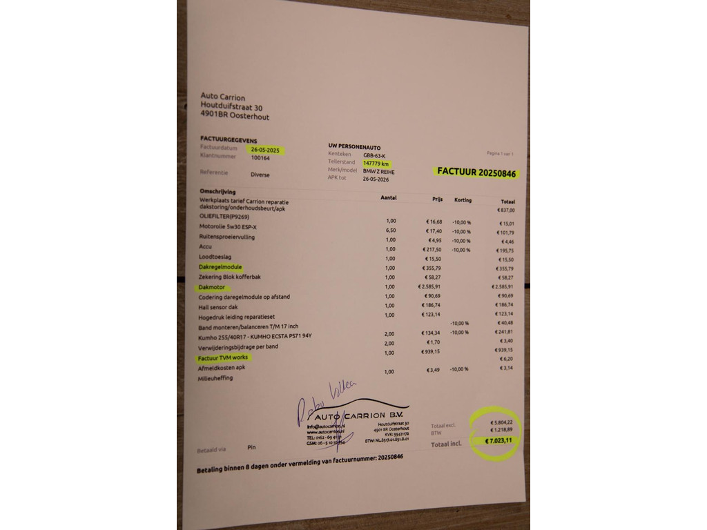 U leest het goed! Zie foto 2 svp, wij hebben er net € 7.000,- aan uitgegeven bij de Vakgarage om deze Z4 hoogwaardig af te leveren aan u. Voor deze kosten komt u niet meer te staan voorlopig. De dak motoren kunnen een kwaal zijn namelijk en deze kosten heeft u inde toekomst niet meer. Dat kunnen anderen aangeboden voertuigen niet garanderen, wij wel middels deze complete factuur. Het rijden kan nu beginnen, hij is dan ook Ideaal voor de hobby of als Youngtimer. Het is gewoonweg een mooie zeer nette verschijning en kleurstelling. De koffie staat voor u klaar.